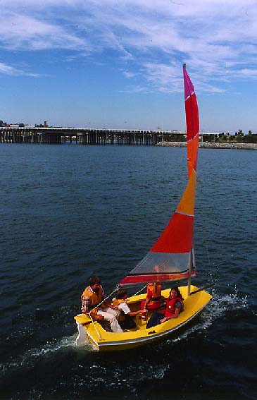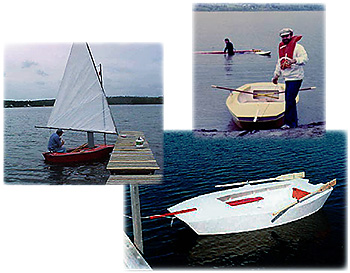 When the editors of Family Circle had asked for a triple-purpose boat (sailing , rowing , and motoring) that was easy for beginners to build, and that could be carried on top of a car, we got to work. The 3-in-1 soon proved to be a capable little performer, outreaching our hopes as a multiuse boat. Only 10' long, the 3-in-1 sails with a surprising amount of spirit in a breeze, even with a family of four aboard. Sail balance is nice, and tacking is surefire; the 3-In-1 is probably our easist boat to sail. The rowing seat doubles as a daggerboard box, and there's a built in outboard well for small outboards or electrics. Storage fore and aft provides space for flotation foam or supplies.