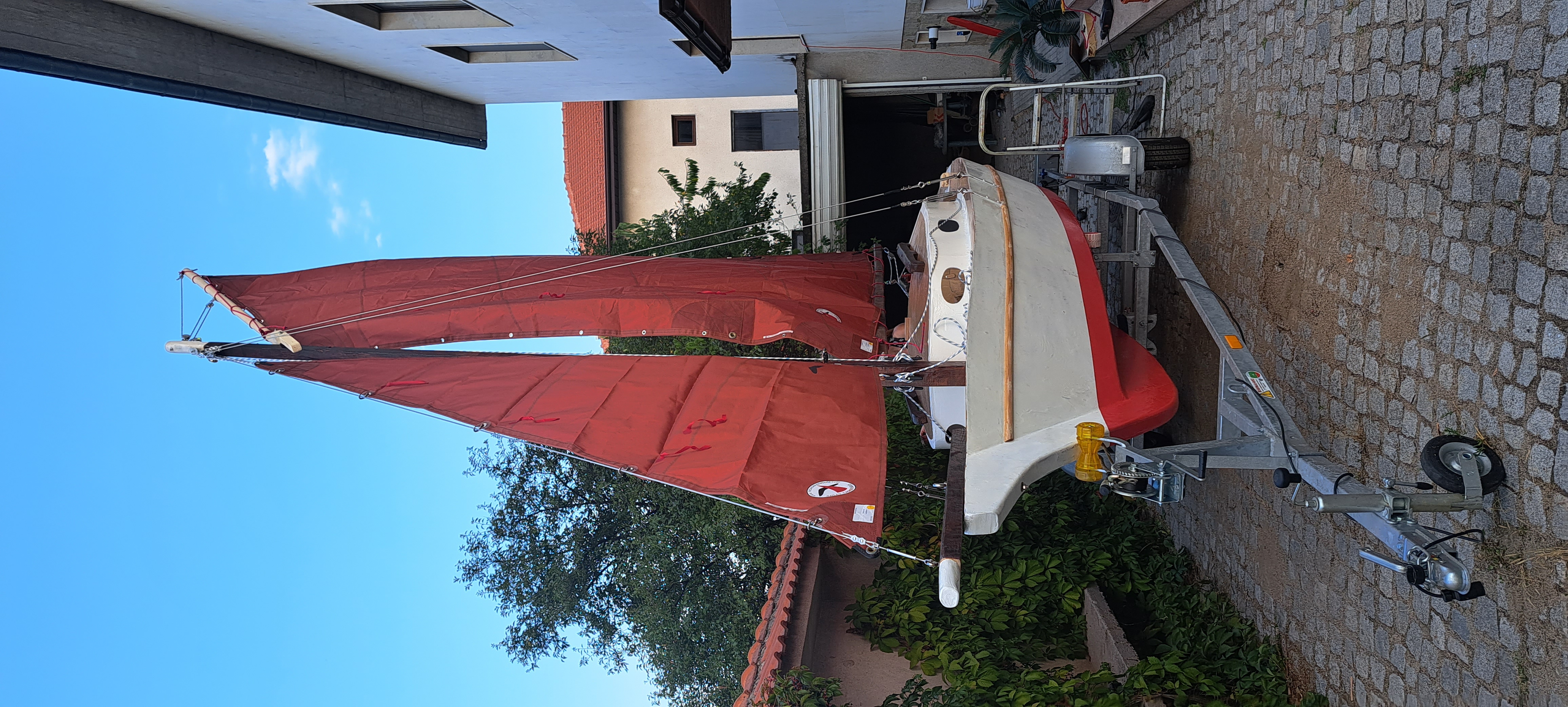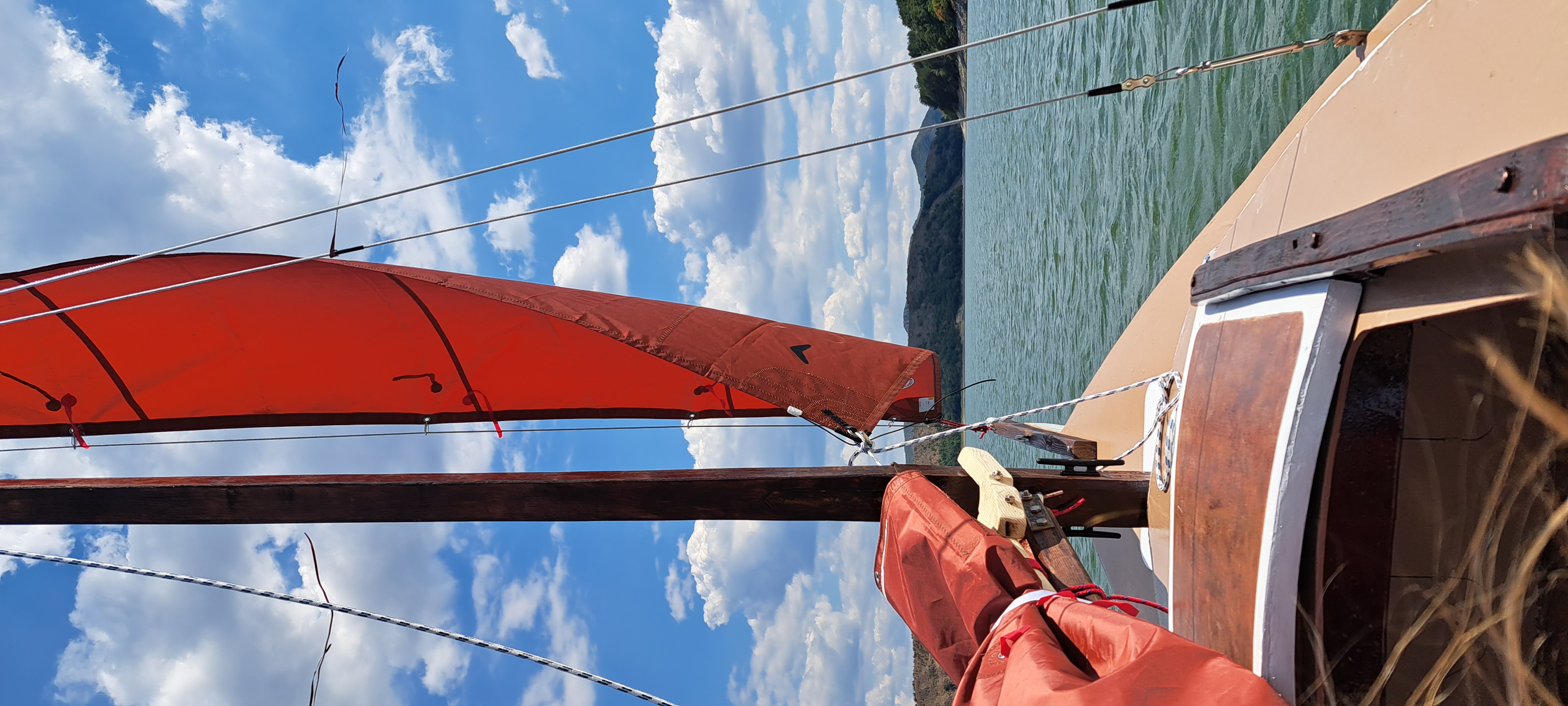 Look at those brand new sails!! It's great to see a set of Tanbark sails. They're becoming a bit more popular lately, interestingly. While we sailed for So Many years — decades! — with tarp sails, and they DO work great, we love the Dacron Sail Sets for the Pocket Yachts. Nice to see these, and they finish off Maistro perfectly!