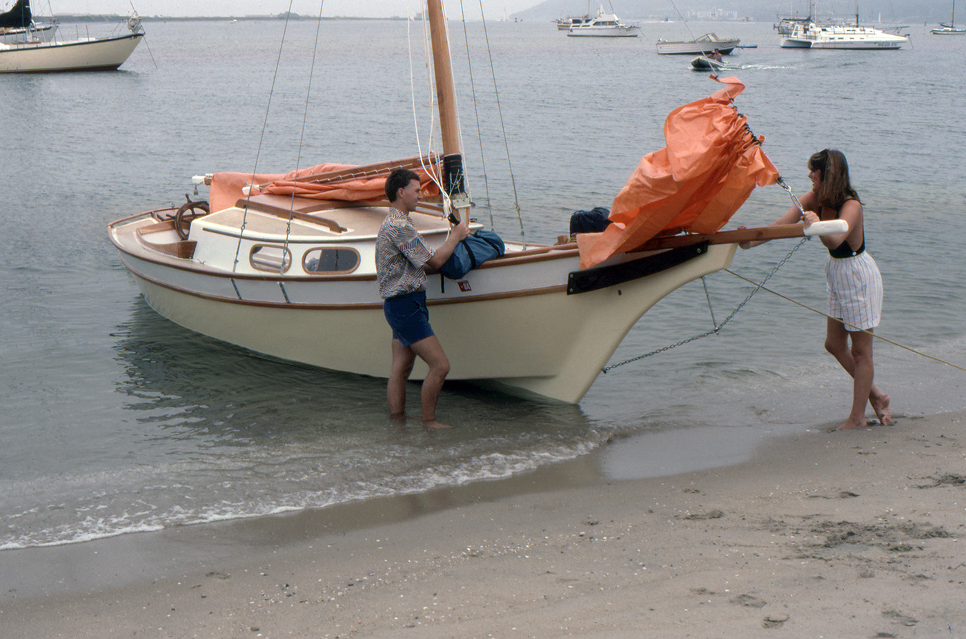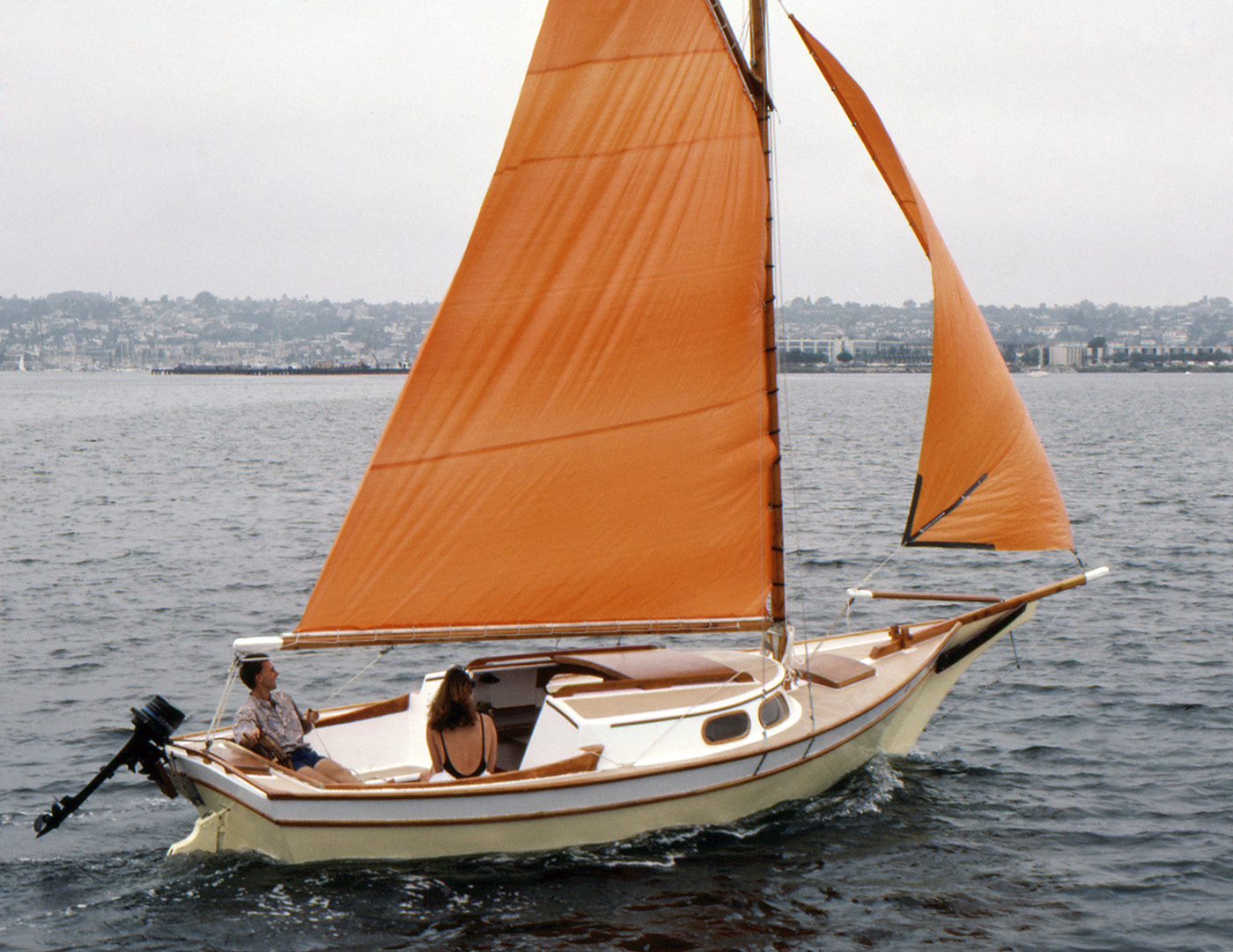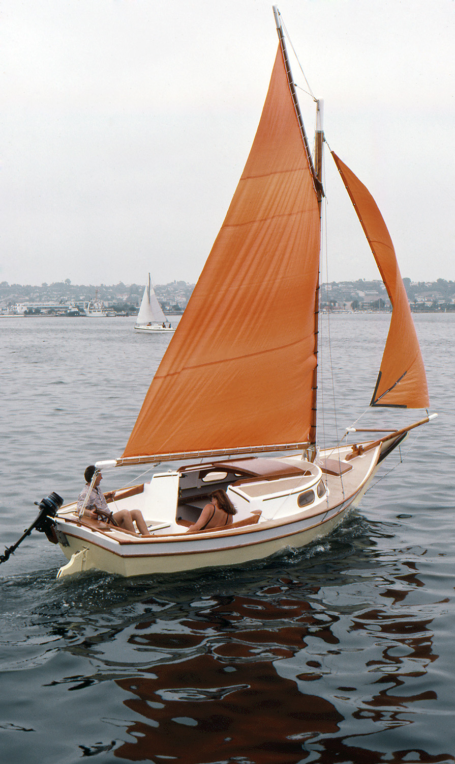The Vacationer grew out of the Weekender; people had been asking for a larger model, so we forged ahead. The Vacationer turned out 21' on deck (24' overall), with the same type of shoal draft, full-length keel and clipper bow that worked so well on the Weekender. She has built in camping fixtures and a more rakish cabin than the Weekender. The Vacationer is a pretty good-sized boat, with a nice smooth sailing feel to match.