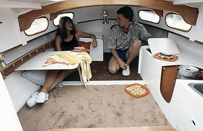 The Vacationer's interior space is spacious, as one would expect from our largest boat. The plans show how we laid out the various amenities, including a stove, sink, cooler, and even a head! (A porta-potty-type head, but it's nice to have!) Some builders choose to change the interior arrangement or even leave the space open for more sleeping area. As you can see from the photo on the right, even with a galley area, there's plenty of room for two people to sleep comfortably.