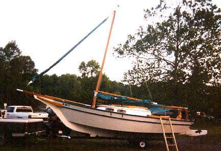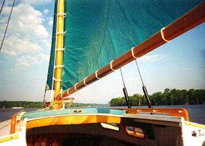 We like the teal-and-white color combination, especially with the green tarp sails. Mr. Lassiter has done a complete job on this boat. He's added a permanent boom-crutch and a simple furling system for his jib. Both the peak and throat halyards are routed to the cockpit.