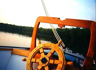 Here one can see the custom boom crutch, and the handmade wheel. What doesn't show up in these shots is the tounge-in-groove cedar deck!