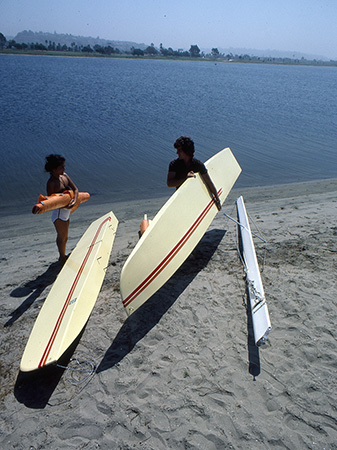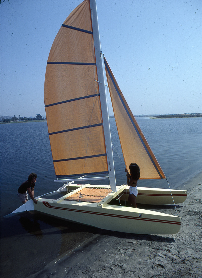 The MINI-CAT was designed to bring some of the newer speed features of the larger, second generation racing catamarans to a smaller sized cat that can be conveniently car-topped to the water. With light-weight, 65-pound hulls, two position rudders for easy beaching and one-man set-up capability, the MINI-CAT is one of the simplest and by far the cheapest catamarans to get sailing.
