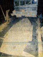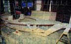 Stolen Moments came together in Jim Rogalski's unheated garage. The keel, at left, upon which everything else is built and the cut-out floor and bulkheads ready to assemble.