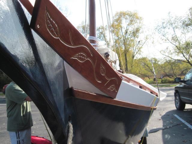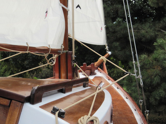 Notice, also, the beautiful gold-leaf carved trailboards, the interesting lashed bowsprit idea, and the more open cockpit ideas. This boat has a great many thoughtful modifications and I imagine they serve Mr. Blake well!